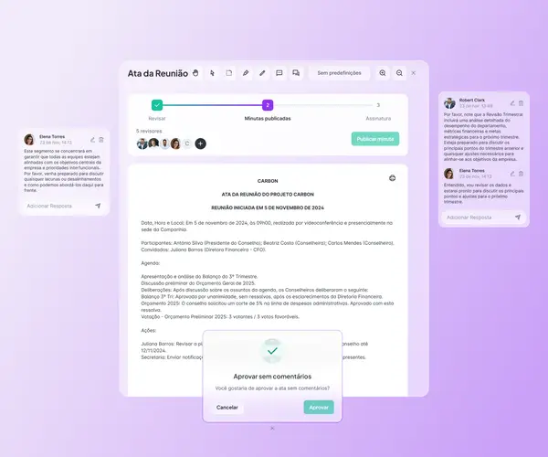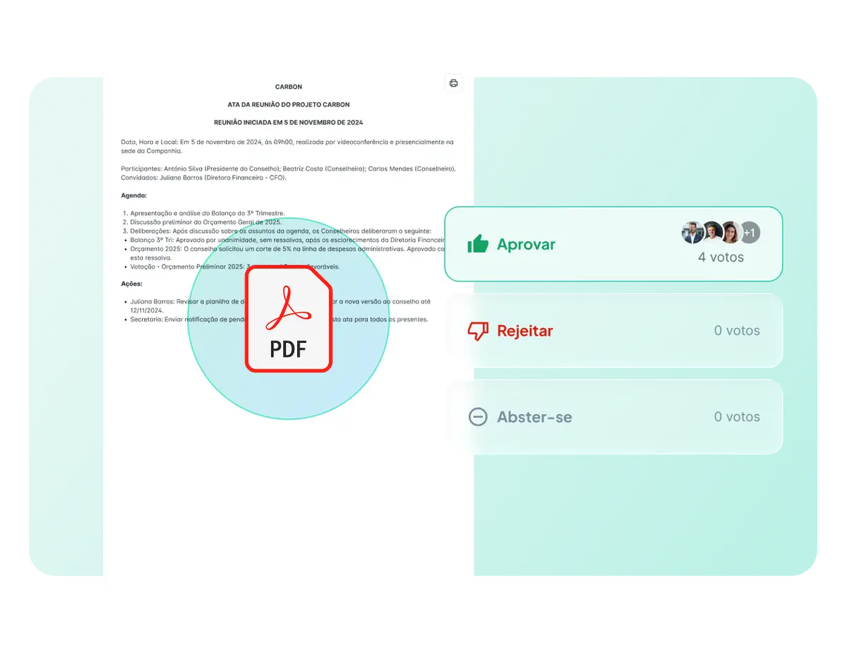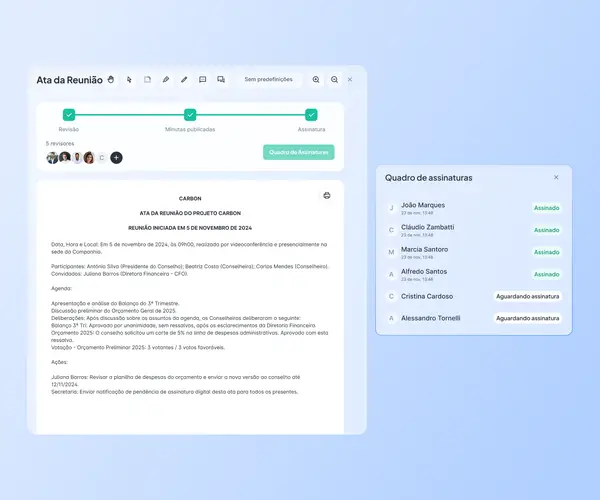 Depois de cada reunião, equipes de governança passam dias redigindo atas, coletando aprovações e correndo atrás de assinaturas por e-mail e ferramentas externas. Isso atrasa decisões, aumenta o risco de registros inconsistentes e expõe documentos sensíveis a canais inseguros.
