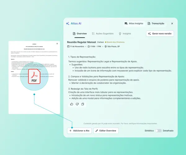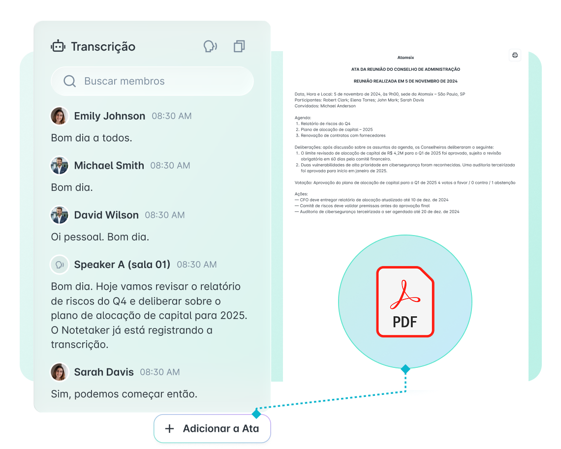 Geração de atas por IA — Decisões, ações e pontos de discussão extraídos e estruturados automaticamente no seu formato