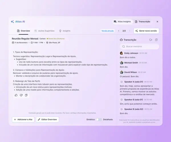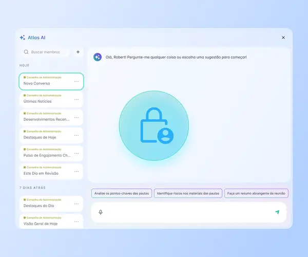 Ferramentas genéricas de IA não entendem o seu negócio. O Atlas Insights analisa todo o seu ecossistema de reuniões: materiais preparatórios, transcrições, atas, deliberações e ações de acompanhamento. Ele enriquece cada resposta com benchmarks de mercado, inteligência competitiva e melhores práticas — para que suas perguntas recebam respostas que realmente importam.