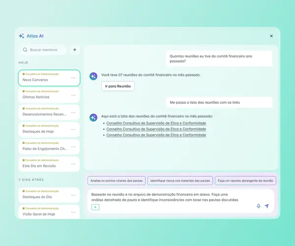 Conselheiros lidam com dezenas de empresas. Secretários de governança gerenciam centenas de páginas por reunião. O Atlas Insights lê todos os seus materiais — pautas, apresentações, demonstrações financeiras, decisões anteriores — e entrega resumos, pontos-chave e análises estratégicas sob demanda. Faça uma pergunta e obtenha uma resposta. Chega de vasculhar PDFs.