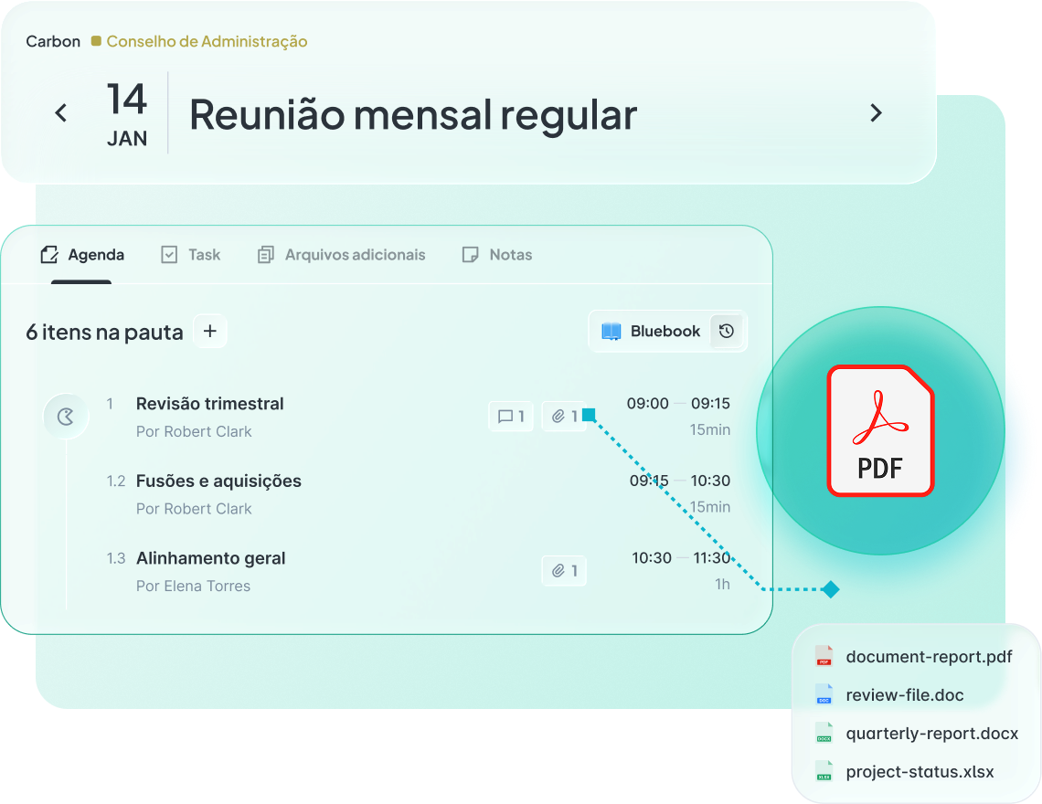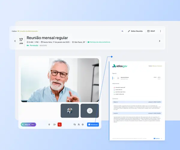 O Atlas centraliza tudo: anexe documentos a cada item da pauta, adicione comentários com @menções, peça documentos aos participantes, proteja PDFs e escolha o que entra no Bluebook. Envie convocações personalizadas — participantes recebem na hora. Chega de encaminhar email. Chega de "em qual pasta estava?"