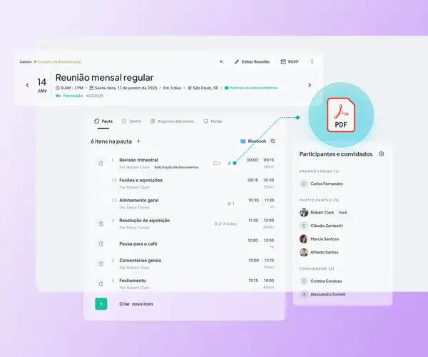 Crie pautas em minutos. Arraste uma pasta, copie uma reunião passada ou configure recorrências automáticas. Anexe materiais, adicione comentários e configure permissões — tudo antes de enviar a convocação.
